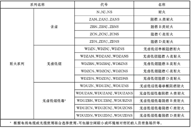 當有多種燃燒特性要求時(shí),其代號按無(wú)鹵(含鹵省略)、低煙、低毒、阻燃和耐火的順序排列組合