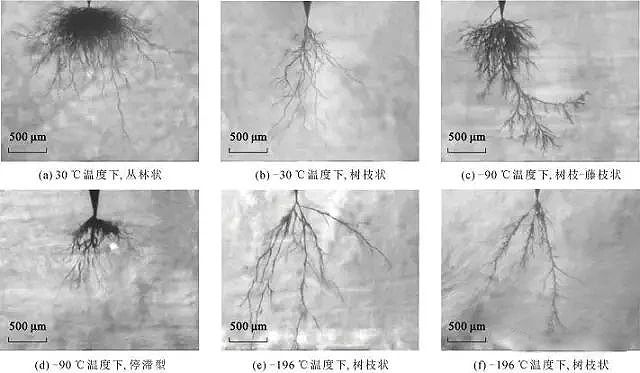 在實(shí)驗過(guò)程中發(fā)現了4種形狀的典型樹(shù),分別為叢林狀、樹(shù)枝狀、停滯型和樹(shù)枝−藤枝狀。電樹(shù)枝的形狀隨著(zhù)溫度變化而變化。